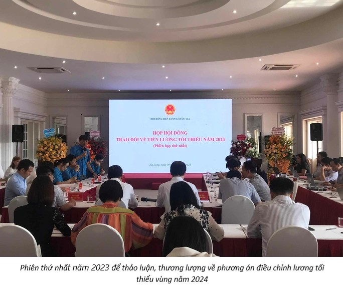 Với sự chia sẻ với khó khăn của cả người lao động và doanh nghiệp, các thành viên Hội đồng Tiền lương Quốc gia đã thống nhất về quan điểm: sẽ phải tăng lương tối thiểu vùng năm 2024, tuy nhiên cần xem xét mức tăng, thời điểm tăng.