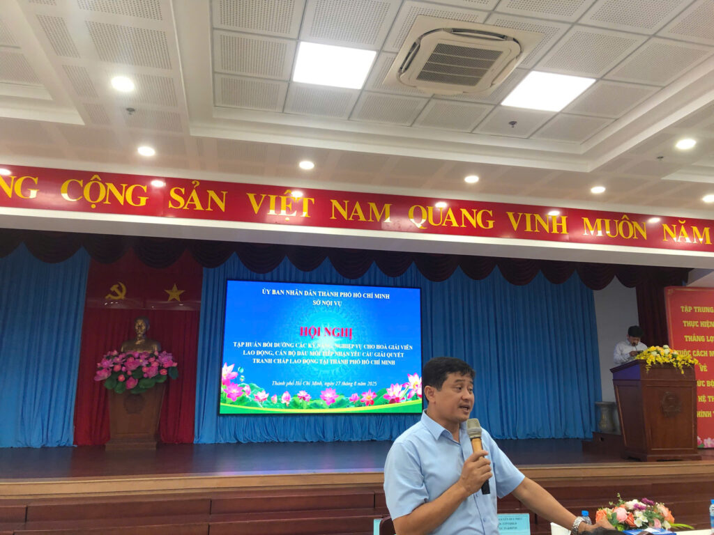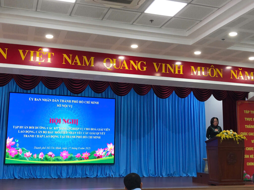 Trung tâm Hỗ trợ phát triển quan hệ lao động – Cục Tiền lương và Bảo hiểm xã hội – Bộ Nội vụ cùng Sở Nội vụ Thành phố Hồ Chí Minh phối hợp với tổ chức Hội nghị “Tập huấn bồi dưỡng kỹ năng nghiệp vụ cho HGVLĐ, cán bộ đầu mối tiếp nhận yêu cầu giải quyết TCLĐ tại TP.HCM” ngày 27/8/2025 .