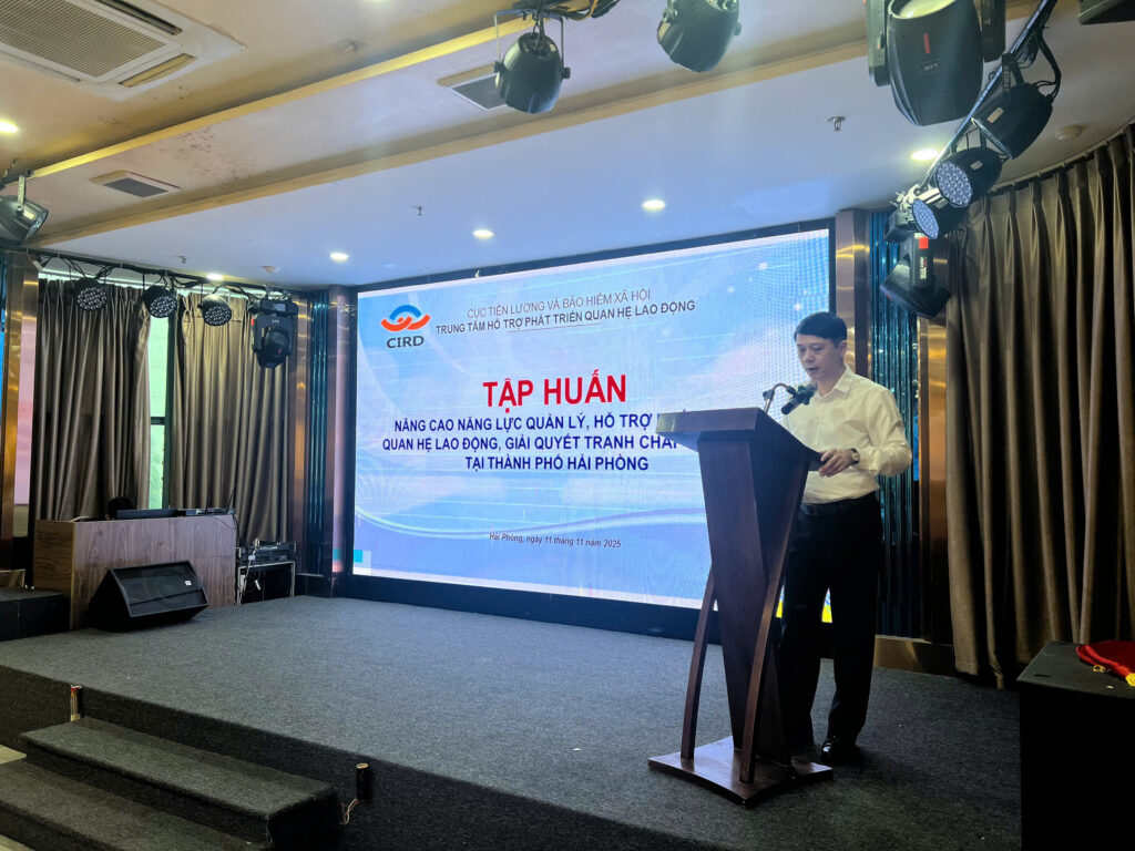 Trung tâm Hỗ trợ phát triển quan hệ lao động – Cục Tiền lương và Bảo hiểm xã hội – Bộ Nội vụ phối hợp với Sở Nội vụ thành phố Hải Phòng tổ chức “Tập huấn nâng cao năng lực quản lý, hỗ trợ phát triển quan hệ lao động, giải quyết tranh chấp lao động tại thành phố Hải Phòng” ngày 11/11/2025 .
