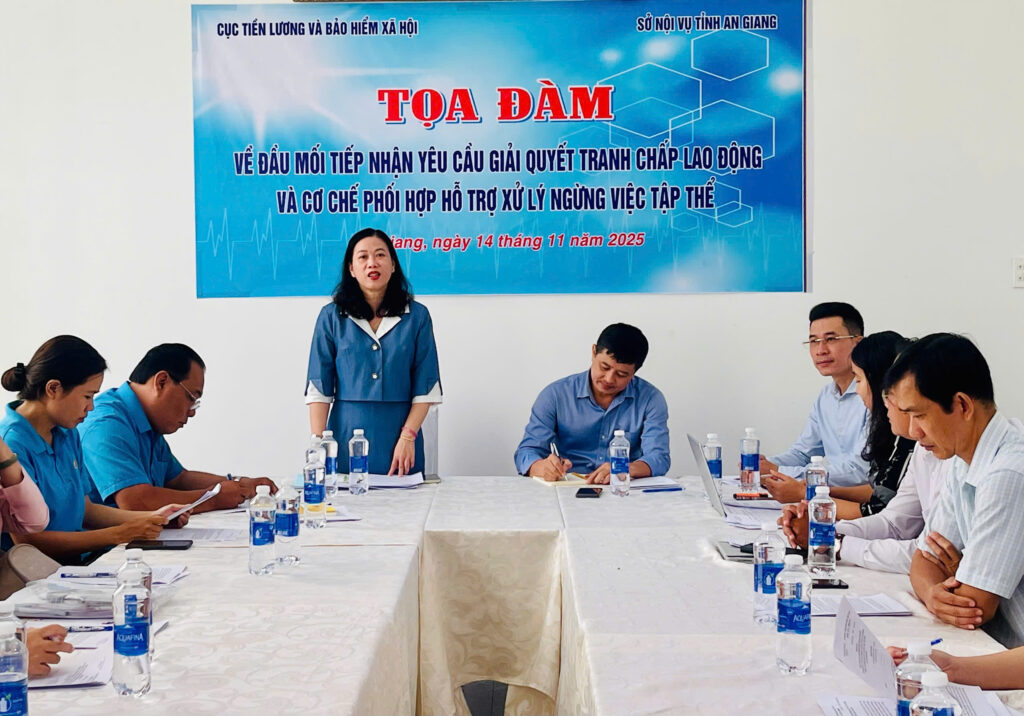 Các đại biểu đã cùng thảo luận về thực tế tình hình tranh chấp lao động tại An Giang cùng với những khó khăn sau khi sắp xếp đơn vị hành chính và tổ chức chính quyền địa phương 2 cấp. Thông qua toạ đàm, An Giang cũng đề xuất về đầu mối tiếp nhận yêu cầu giải quyết tranh chấp lao động: (1) Đề nghị Bộ Nội vụ hướng dẫn, hỗ trợ địa phương về chuyên môn, nghiệp vụ đầu mối tiếp nhận yêu cầu giải quyết tranh chấp lao động; (2) Tổ chức các chương trình tập huấn định kỳ và chuyên sâu về kỹ năng hòa giải, kiến thức pháp luật chuyên biệt (ví dụ: sa thải trái pháp luật, chấm dứt hợp đồng lao động, quy chế tiền lương) cho cả cán bộ đầu mối và hòa giải viên lao động. Về cơ chế phối hợp hỗ trợ xử lý ngừng việc tập thể, An Giang đề nghị Bộ Nội vụ hỗ trợ địa phương đào tạo, bồi dưỡng nâng cao trình độ, kỹ năng nghiệp vụ cho công chức làm công tác quản lý quan hệ lao động; xem xét, hỗ trợ địa phương xây dựng quy trình về cơ chế phối hợp hỗ trợ giải quyết xung đột giữa người lao động, người sử dụng lao động trong trường hợp xảy ra ngừng việc tập thể tại nơi làm việc.