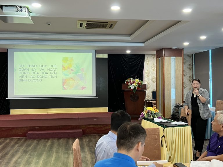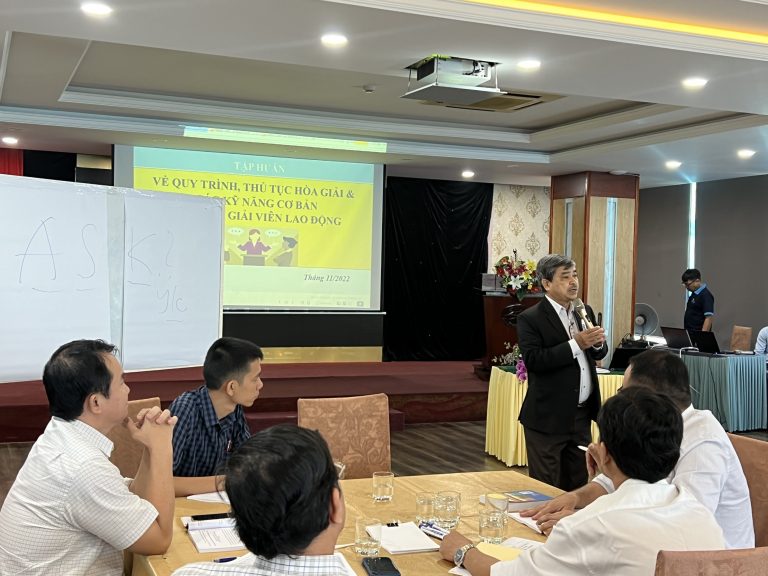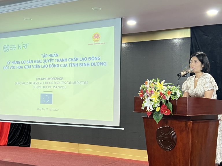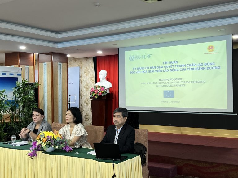 Tiếp tục triển khai các hoạt động trong khuôn khổ Dự án NIRF, ngày 17-18/11/2022, tại thành phố Vũng Tàu, Cục Quan hệ lao động và Tiền lương, Bộ Lao động – Thương binh và Xã hội phối hợp với ILO, tổ chức lớp tập huấn kỹ năng cơ bản giải quyết tranh chấp lao động đối với hoà giải viên lao động tỉnh Bình Dương.
