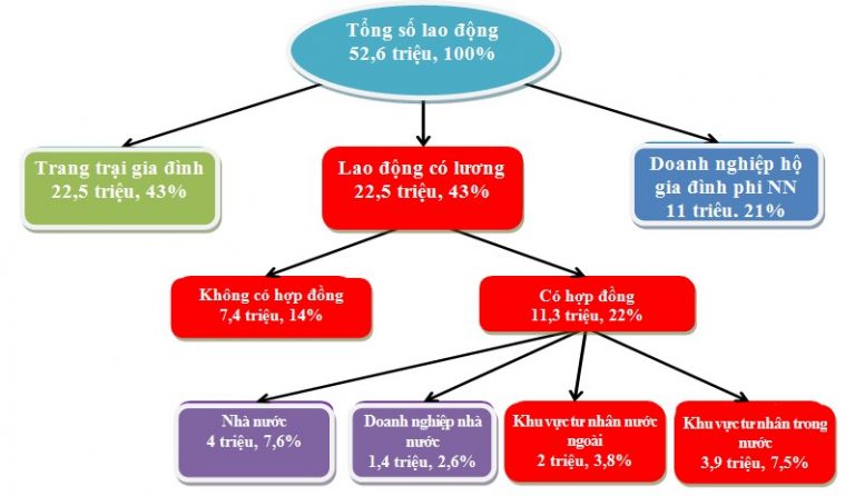 Tỷ trọng lao động làm việc trong khu vực nông – lâm – ngư nghiệp ở Việt Nam đã giảm nhanh với tốc độ 1,6% mỗi năm trong giai đoạn 30 năm qua chủ yếu do lao động từ khu vực này chuyển sang các doanh nghiệp phi nông, hộ gia đình phi nông và làm việc được trả công. Năm 1989, hơn 71% lao động Việt Nam làm việc trong khu vực nông – lâm – ngư nghiệp và khi đó việc làm tư nhân hầu như không tồn tại. Tuy nhiên đến năm 2019, tỷ lệ này đã giảm đáng kể với 42% lao động làm việc trong khu vực nông – lâm – ngư nghiệp. Trang trại và các doanh nghiệp hộ gia đình đã góp phần cải thiện mức sống cho hàng triệu người lao động song lại bị hạn chế về tiềm năng sản xuất, vốn, công nghệ và năng suất lao động. Theo phân loại thống kê hiện nay, lao động làm việc cho các trang trại gia đình hoặc hộ gia đình phi nông nghiệp là thuộc nhóm “lao động ăn lương” (Hình 1). Tuy nhiên, trên thực tế số lao động này không có hợp đồng làm việc. Khi có việc thì lao động được gọi đến làm việc, khi hết việc thì tạm nghỉ ở nhà chờ cho đến khi có đơn hàng mới. Để có thêm thu nhập, nhu cầu tăng ca của người lao động là rất lớn mặc cho những khó khăn, hạn chế về thời gian, sức khỏe, điều kiện lao động. Nhiều doanh nghiệp còn cố tình chây ì, thậm chí không đóng bảo hiểm xã hội cho người lao động. Quan hệ lao động trở nên căng thẳng, phức tạp với nhiều bất cập, thể hiện ở những tranh chấp về tiền lương, hợp đồng lao động, bảo hiểm, đòi hỏi xem xét thấu đáo và những can thiệp, điều chỉnh chính sách cho phù hợp.