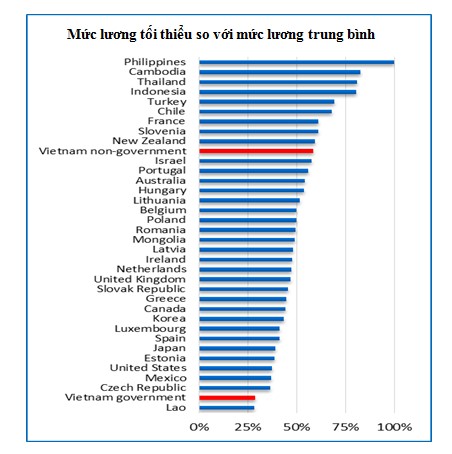 Khi so sánh mức lương tối thiểu với mức lương trung bình thì mức lương tối thiểu của khu vực tư nhân ở Việt Nam lại cao so với các nước khác, trong khi mức lương của khu vực công lại thua kém nhiều nước trong khu vực và trên thế giới (Hình 3).