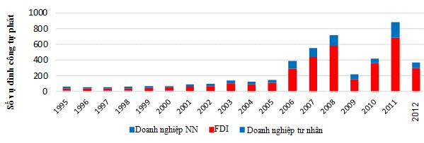 Vai trò của các hiệp hội chủ sử dụng lao động như Phòng Thương Thương mại và Công nghiệp Việt Nam (VCCI), Liên minh Hợp tác xã Việt Nam (VCA) cũng khá phức tạp. Các hiệp hội này có kinh nghiệm hơn trong việc thúc đẩy các chính sách, duy trì các hoạt động công đoàn hơn là tham gia trực tiếp giải quyết các mâu thuẫn trong quan hệ lao động. Nhưng các tổ chức này lại do Nhà nước chỉ định và hỗ trợ nên nhiều khi không đại diện cho lợi ích của các bên, người lao động cũng như người sử dụng lao động có liên quan (Trịnh Khánh Ly, 2015). Ví dụ minh chứng cho yếu kém này là số lượng lớn các cuộc nghỉ việc tập thể và đình công tự phát ở Việt Nam. Mặc dù Luật Lao động đã có quy định về đình công nhưng các thủ tục quá rườm rà và vai trò không rõ ràng của công đoàn nên chưa có một cuộc đình công nào theo đúng quy định của luật pháp. Thay vào đó, các cuộc đình công đều được xem như “tự phát” và rất nhiều cuộc vi phạm các quy định hiện hành. Những cuộc đình công tự phát này có xu hướng gia tăng, mặc dù có sự dao động lớn về số lượng từ năm này qua năm khác. Số liệu hạn chế có được cho thấy phần lớn các cuộc đình công này diễn ra trong khu vực doanh nghiệp nước ngoài, phản ánh những hạn chế trong cơ chế giải quyết tranh chấp lao động hiện nay trong quá trình hội nhập (Hình 4).